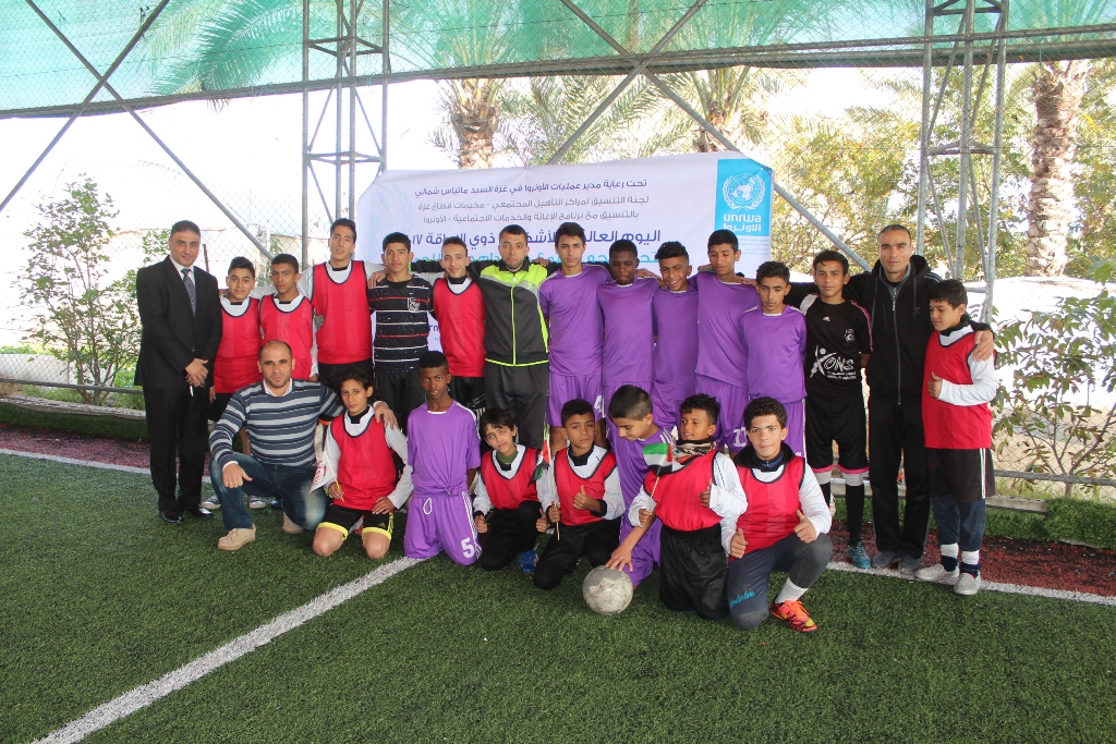 نظمت جمعية الأمل للتأهيل – رفح مبارة كرة قدم ودية بين فريقي مدرسة الأمل للصم بالجمعية و مدرسة ج الإعدادية بنين ، تحت شعار "كلنا يد واحدة " ضمن فعاليات يوم المعاق العالمي علي أرض ملعب العمدة المعشب برفح.