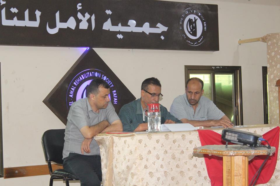 عقدت جمعية الأمل للتأهيل -رفح اجتماع الجمعية العمومية السنوي وذلك لعرض وإقرار كلاً من التقارير المالية والإدارية الخاصة بالجمعية،بحضور رئيس مجلس إدارة الجمعية السيد زياد العابد وأعضاء مجلس الإدارة وأعضاء الجمعية العمومية.