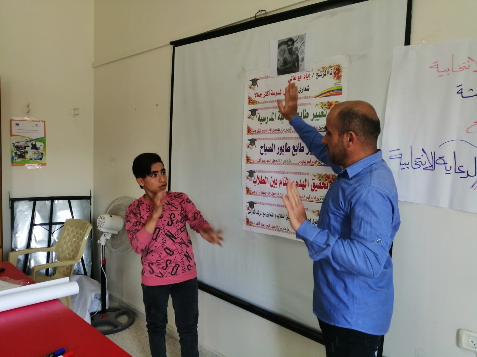جانب من مشاركة طلبة مدرسة الأمل للصم في الدعاية الانتخابية للمرشحين وذلك ضمن فعاليات مشروع المحاكاة الانتخابية في مدارس ذوي الاعاقة والمنفذ من قبل لجنة الانتخابات المركزية وبتمويل من الاتحاد الأوروبي