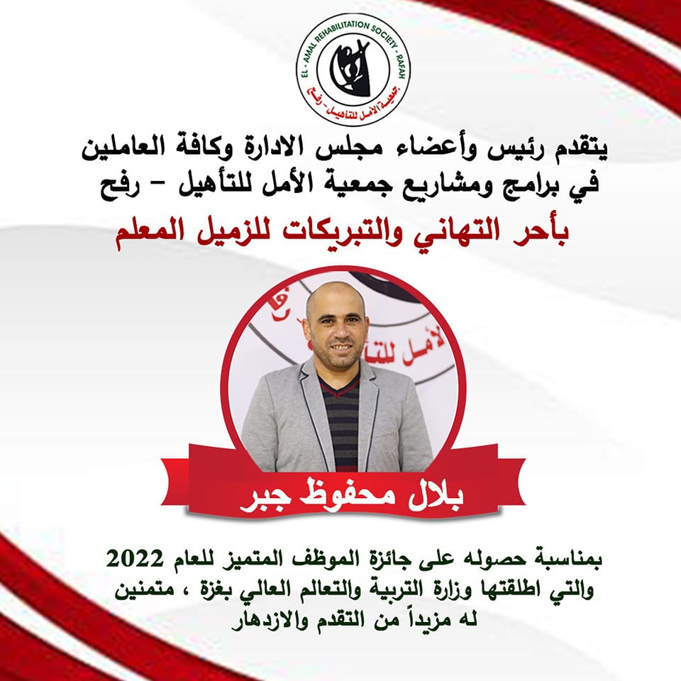 يتقدم مجلس ادارة جمعية الأمل وكافة العاملين فيها للزميل بلال جبر لحصولة علي الموظف المتميز للعام 2022 والتي اطلقتها وزارة التربية والتعليم العالي