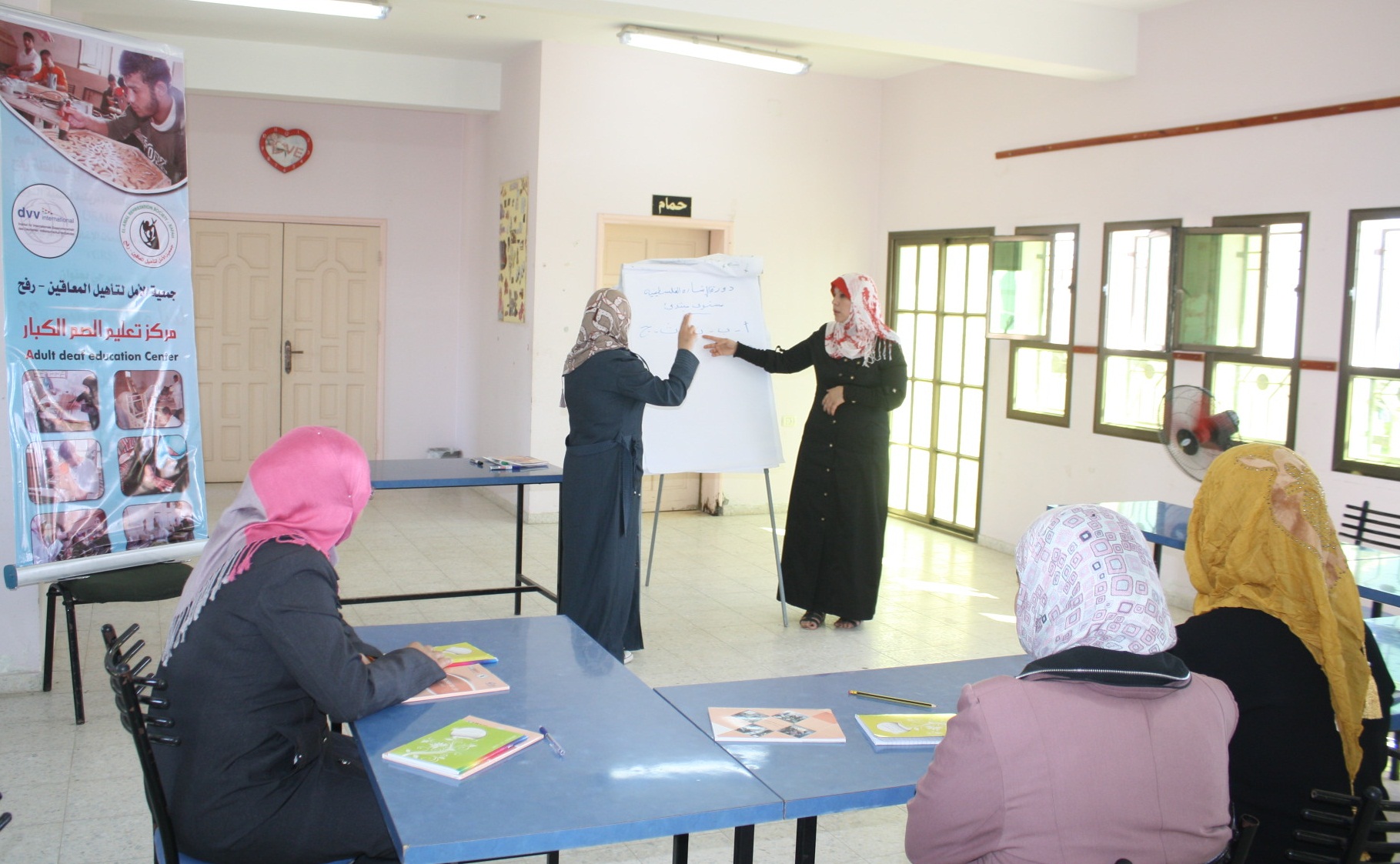 تفذت جمعية الامل لتأهيل المعاقين بمقرها الرئيس بمحافظة رفح دورة لغة اشارة مبتدئة للصم الكبار ضمن برنامج تعليم الصم الكبار المنفذ بالتعاون مع مؤسسة dVV الالمانية لتعليم الكبار.