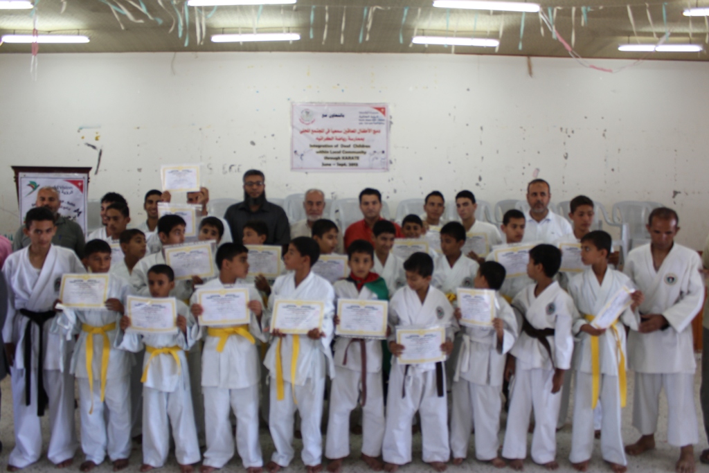 نظم نادي الامل للصم التابع لجمعية الأمل لتأهيل المعاقين رفح حفل تخريج الطلاب الصم من الدورة التدريبية لرياضية لفنون الكاراتيه جاء ذلك ضمن مشروع دمج الاطفال المعاقين سمعيا في المجتمع المحلي لممارسة رياضة الكاراتيه بالتعاون مع مركز الوليد للكارتيه بتمويل من تنمية جنوب غزة الرؤيا العالمية .بحضور حشد لفيف من الطلبة وأولياء الأمور والمجتمع المحلي .