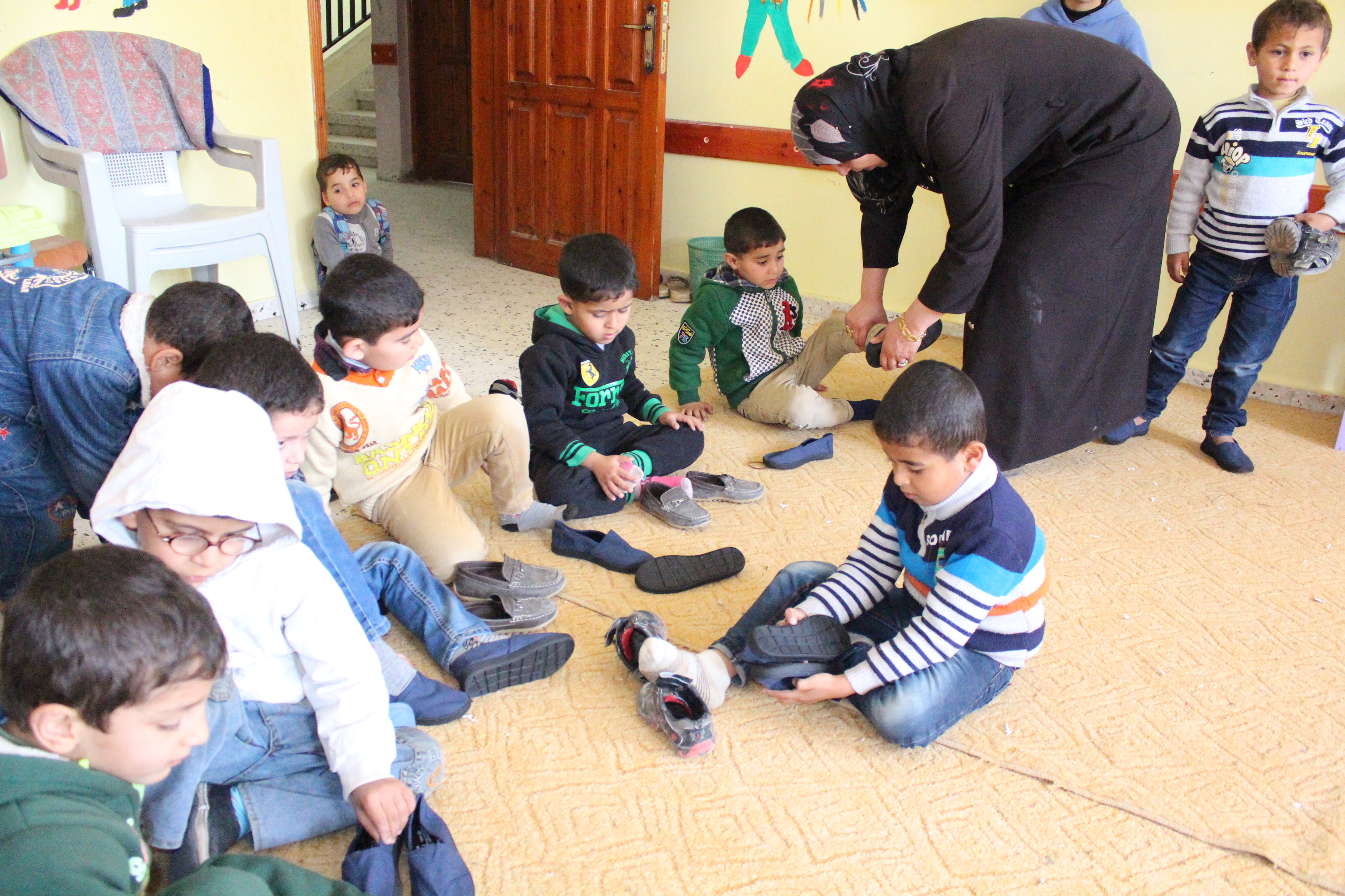 روضة الأمل النموذجية بنادي السنابل التابع لجمعية الأمل لتأهيل المعاقين رفح توزع أحذية علي طلاب الروضة والبالغ عددهم 230طفل وطفلة بدعم من مؤسسة أنيرا جاء ذلك كمساعدة لأطفال الرياض .