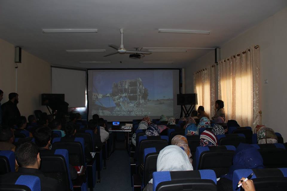 عرضت مؤسسة فرونت لاين اليابانية بالشراكة مع جمعية الأمل لتأهيل المعاقين رفح فيلم الحجر العجيب في سماء غزة وذلك بالكلية العربية الجامعية للعلوم التطبيقية .بحضور كل من زياد العابد رئيس مجلس إدارة جمعية الأمل وروحي عواجة نائب عميد الجامعة الترحيب وحسن الاستقبال .