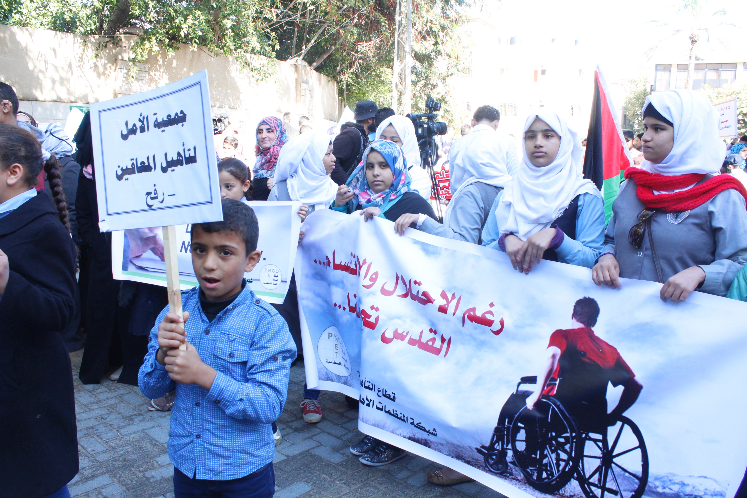 حيث طالب المئات من الأشخاص ذوي الإعاقة وممثلو مؤسسات أهلية وحقوقية في قطاع غزة المجتمع الدولي بتدخل فوري وعاجل من أجل رفع الحصار عن قطاع غزة وتداعياته الخطيرة على مختلف مناحي الحياة ومحاسبة الاحتلال على جرائمه بحق الشعب الفلسطيني بمختلف قطاعاته بمن فيهم الأشخاص ذوي الإعاقة ومؤسساتهم.