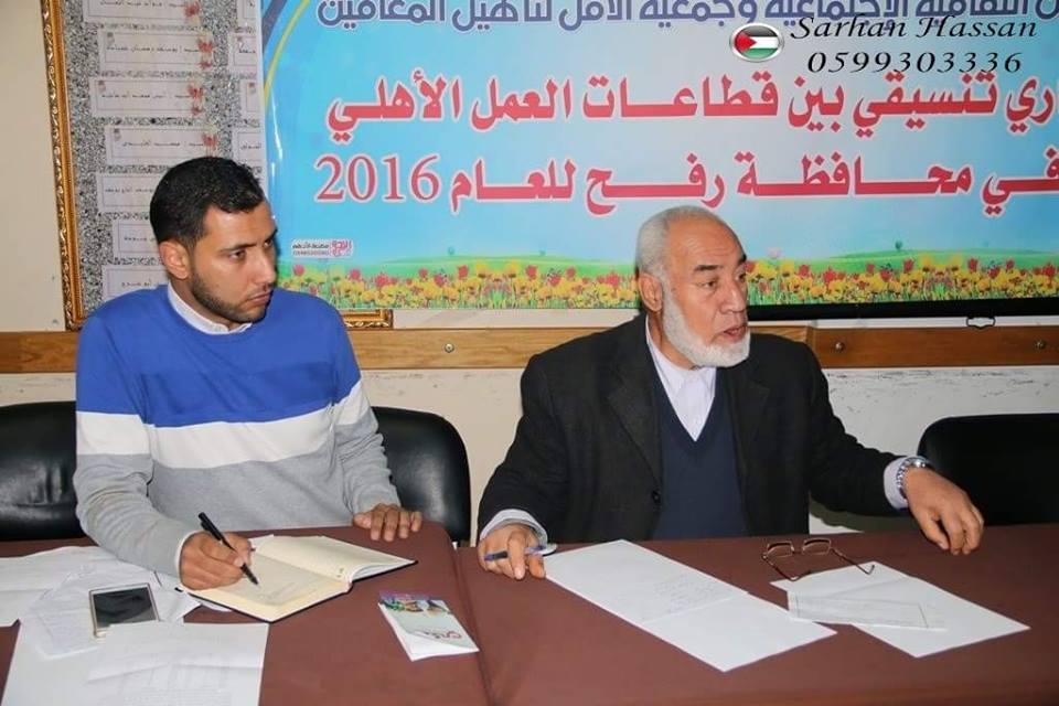 استقبلت جمعية الامل لتأهيل المعاقين رفح مؤسسات المجتمع المدني في لقاء حواري تنسيقي موسع ونوعي لمؤسسات المجتمع المدني وشركات القطاع الخاص لتحديد احتياجات محافظة رفح علي المستوي المجتمعي للعام 2016